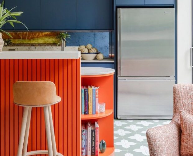 A cozinha integrada, desenvolvida pelo estúdio Brooke Copp-Barton, apresenta uma bancada de refeições em laranja intenso, combinada com módulos em azul, criando um contraste atrativo.